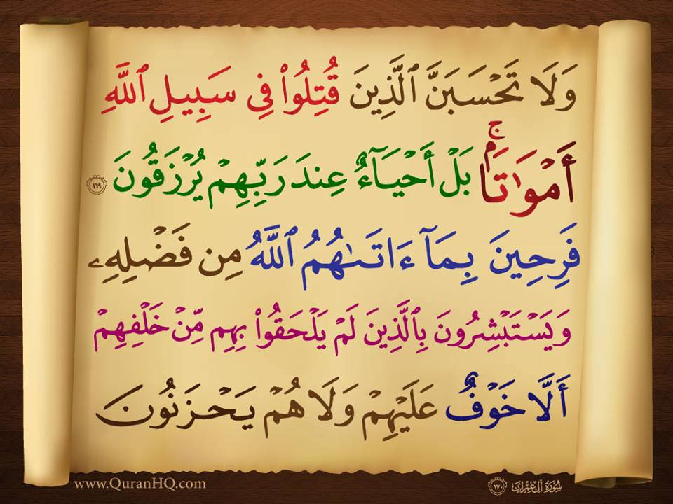 ولا تحسبن الذين قتلوا في سبيل الله أمواتا بل أحياء عند ربهم يرزقون فرحين بما آتاهم الله من فضله