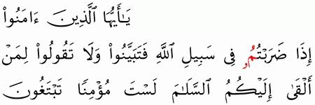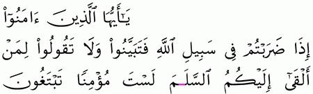 ي ا أ ي ه ا ال ذ ين آم ن وا إ ذ ا ض ر ب ت م ف ي س ب يل الل ه ف ت ب ي ن وا و ل ا ت ق ول وا ل م ن أ ل ق ى إ ل ي ك م الس ل ام ل س ت م ؤ م ن ا ت ب ت غ ون ع ر ض ال ح ي اة الد ن ي ا ف ع ن د الل ه م غ ان م ك ث ير ة ك ذ ل ك ك ن ت م م ن